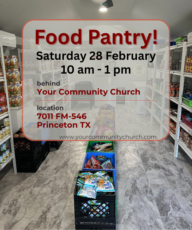 The Food Pantry is open on the 2nd & 4th Saturdays each month. We are located behind Your Community Church.